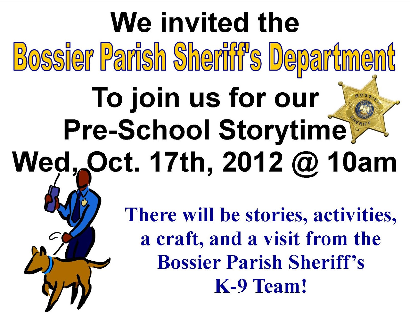 Children are reminded before each story hour to please: use the restroom, be quiet in the library, always have shoes, shirts, etc, on while in the library, have no food or drink inside the library, and to NOT run while in the library.